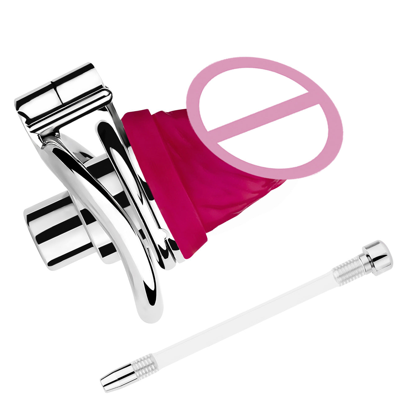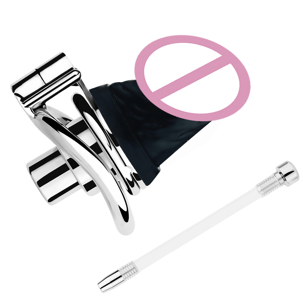 Metal Inverted Chastity Cage with Detachable Urethral Tube and Large Dildo