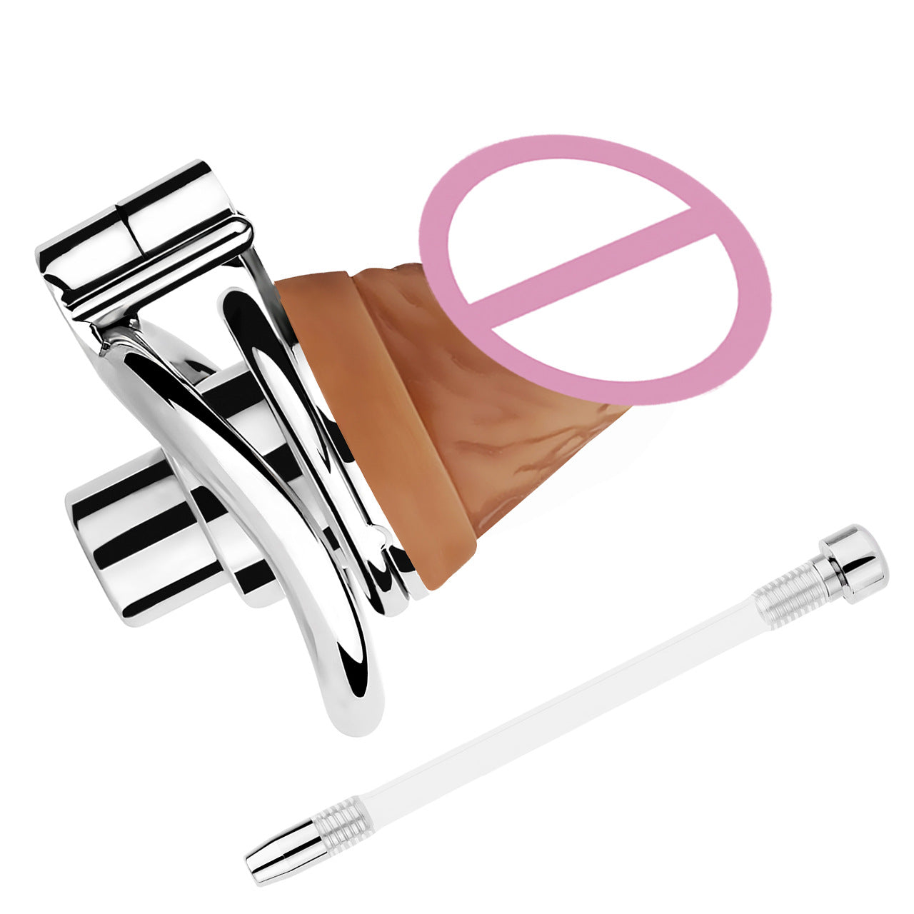 Metal Inverted Chastity Cage with Detachable Urethral Tube and Small Dildo